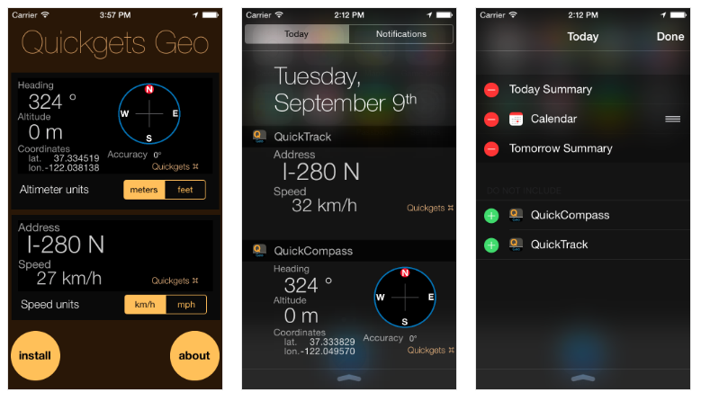 The first compass, heading, altimeter, speedometer, weather & street info widgets for your Today screen.